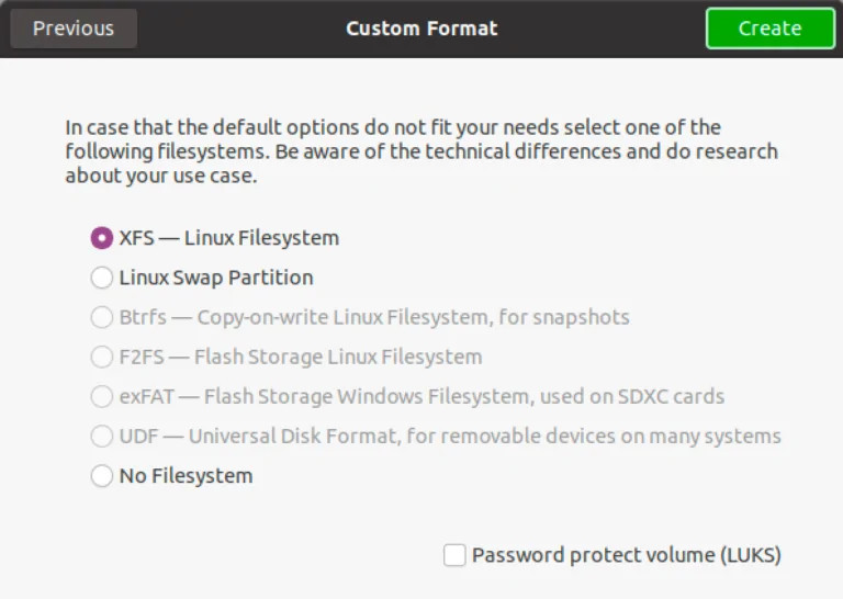 اگر گزینه XFS غیرفعال است، از gnome-disks خارج شده و قبل از تلاش مجدد، بسته xfsprogs را نصب کنید:
