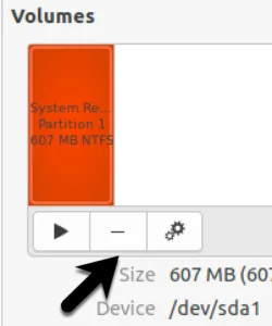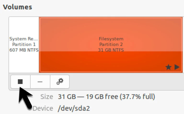 در مثال بالا، دیسک مربوطه شامل دو پارتیشن  NTFSویندوز است که باید حذف شوند. هر پارتیشن NTFS با ستاره‌ای که در نقشه دیسک نشان داده شده است (مانند پارتیشن برجسته شده در تصویر فوق) باید قبل از حذف unmount شود. این کار را می‌توان با انتخاب پارتیشن و کلیک بر روی دکمه unmount مطابق تصویر زیر در زیر بدست آورد: