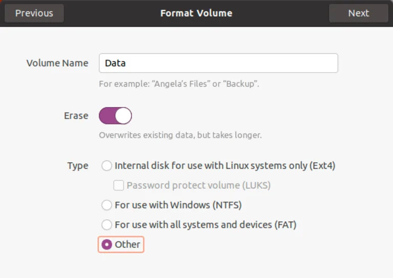 روی Next کلیک کنید و در صفحه بعد، نامی برای پارتیشن جدید وارد کرده و انتخاب کنید که آیا پارتیشن باید در هنگام ایجاد پاک شود یا خیر. این باعث می‌شود که روند ایجاد، بیشتر طول بکشد اما یک گزینه توصیه شده است. در نهایت، نوع فایل‌سیستم را برای پارتیشن انتخاب کنید. این معمولا ext4 یا XFS خواهد بود. با توجه به مزایای XFS، قبل از کلیک روی دکمه بعدی، Other را انتخاب کنید: