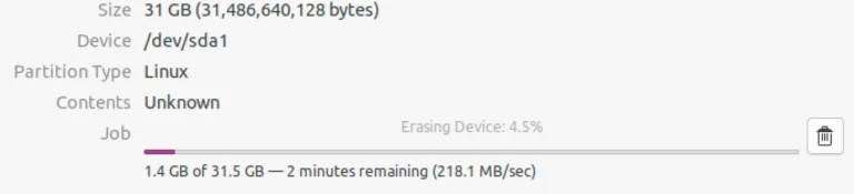 ابزار gnome-disks فرمت‌بندی را آغاز کرده و وضعیت فرآیند را نمایش می‌دهد: