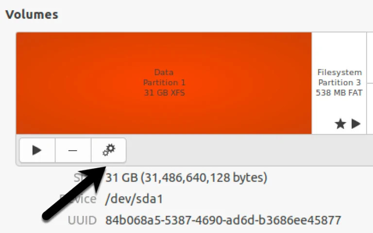پس از آماده شدن پارتیشن، می‌توان آن را از خط فرمان یا با استفاده از ابزار gnomedisks نصب کرد. برای پیکربندی نقطه اتصال، پارتیشن را انتخاب کرده و بر روی دکمه تنظیمات مطابق تصویر زیر کلیک کنید: