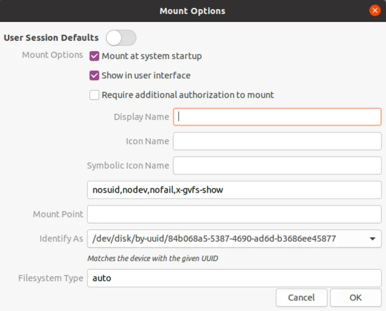 User Session Defaults را خاموش کرده و نقطه اتصال را مطابق نیاز خود پیکربندی کنید. در تصویر بالا، پارتیشن در هنگام راه‌اندازی سیستم در /data نصب شده و پیکربندی شده است تا با برچسب Data مشخص شود.