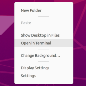 اگر اوبونتو را با دسکتاپ GNOME اجرا میکنید و نیاز به دسترسی به خط فرمان دارید، باید پنجره ترمینال را باز کنید. میتوان با کلیک راست روی پسزمینه دسکتاپ و انتخاب گزینه منوی Open Terminal مطابق تصویر زیر ترمینال را گشود.
